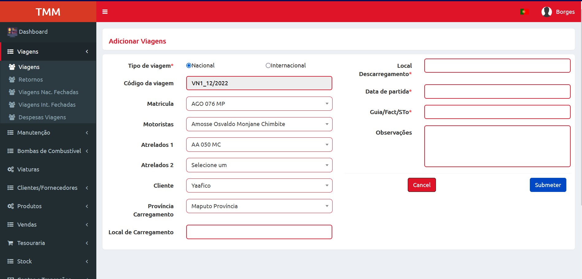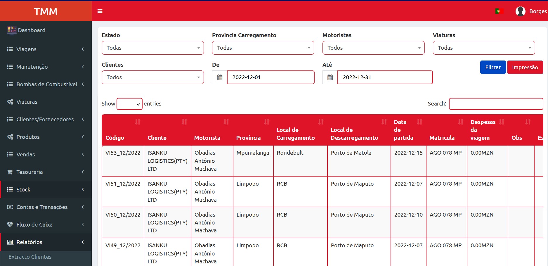 Aplicativo de logística, multi-funcional. Inclui os módulos de de viagens, manutenção, bombas de abastecimento, fluxo de caixa, facturação, etc.